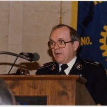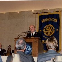 A 4x6 photograph of Andy Miller making a speech at a Los Angeles Rotary No.5 Meeting.