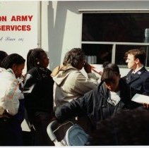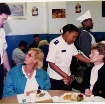 A 4x6 photograph of an officer and a soldier greeting women at a Thanksgiving lunch held at the LA Safe Harbor.