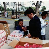 A 4x6 photograph of a cadet giving a boy a carton of milk as part of Emergency Disaster Services following the 1994 Northridge earthquake.