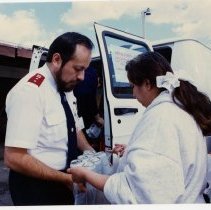 A 4x6 photograph of an officer handing out water as part of Emergency Disaster Services following the 1994 Northridge earthquake.